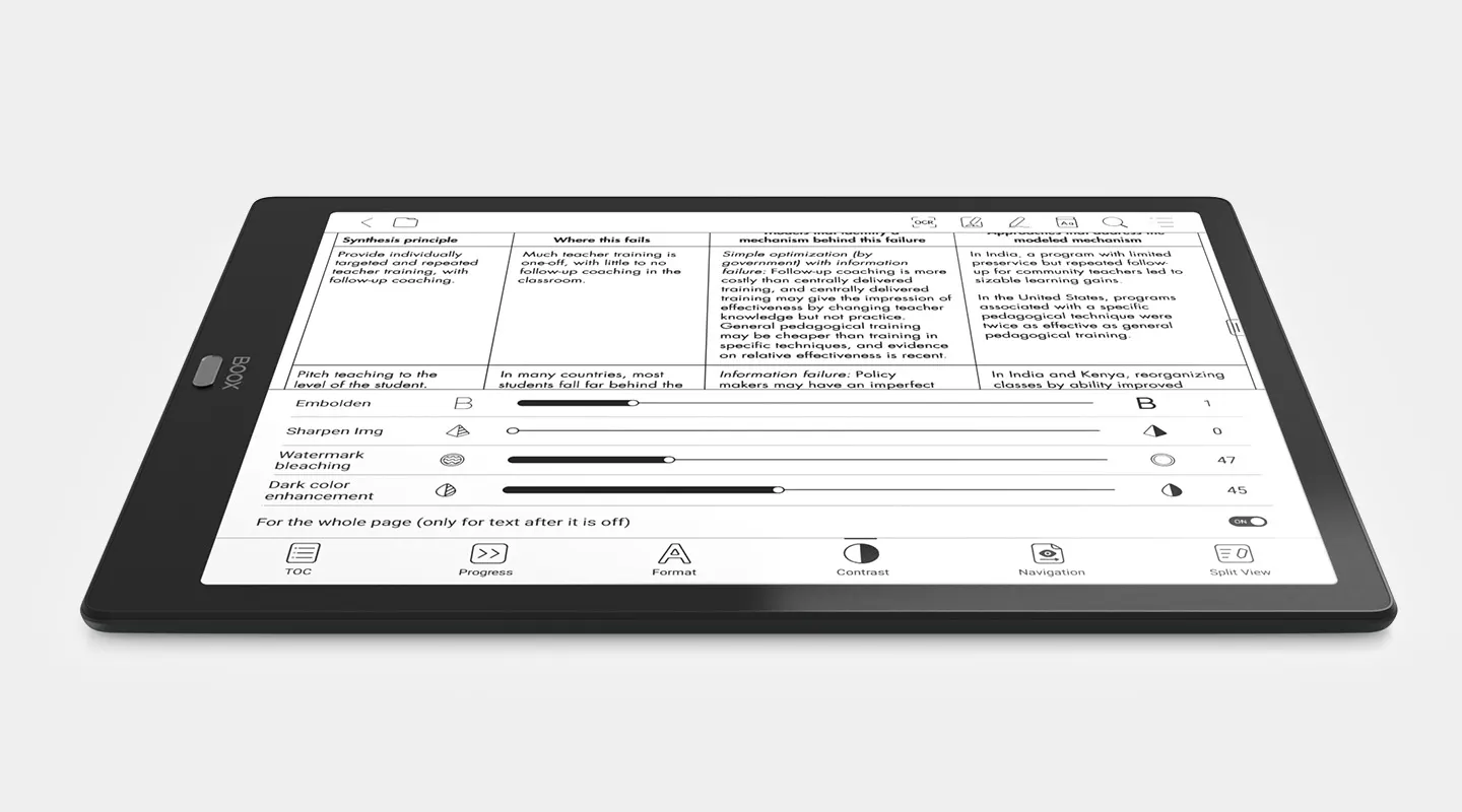 На големия екран на Max Lumi2 може удобно да четете цифрови документи и да персонализирате изживяването си при четене с множеството инструменти.